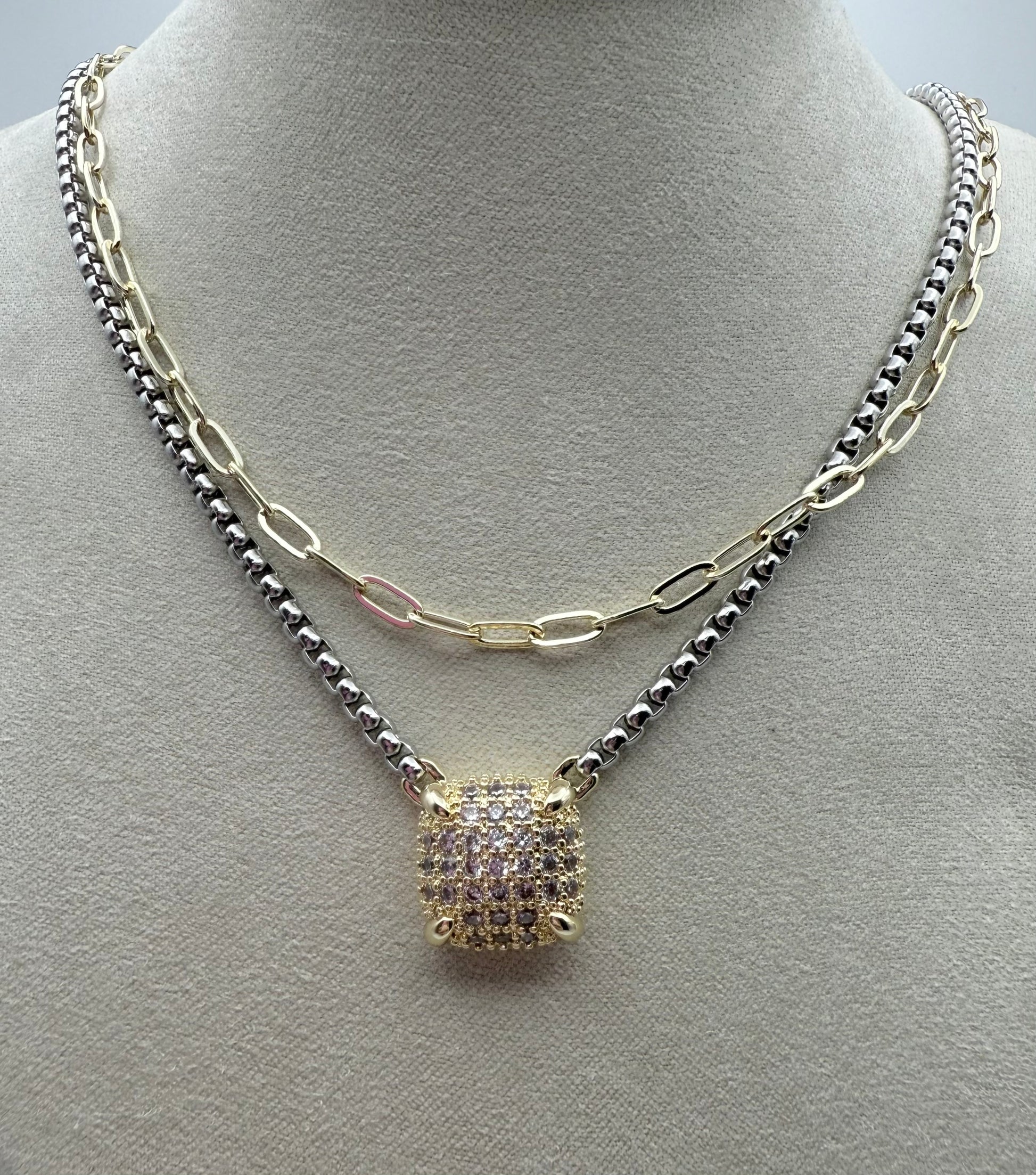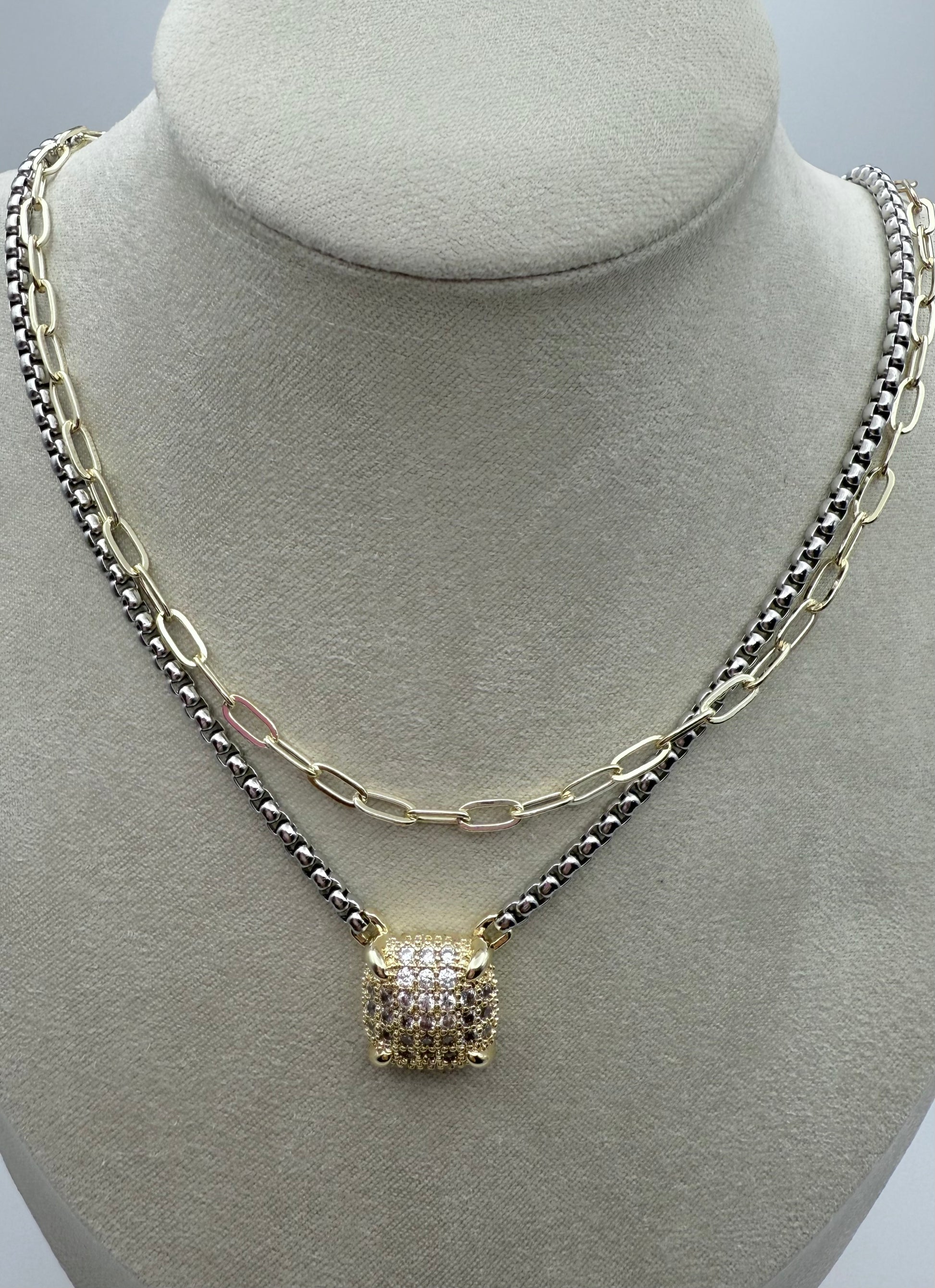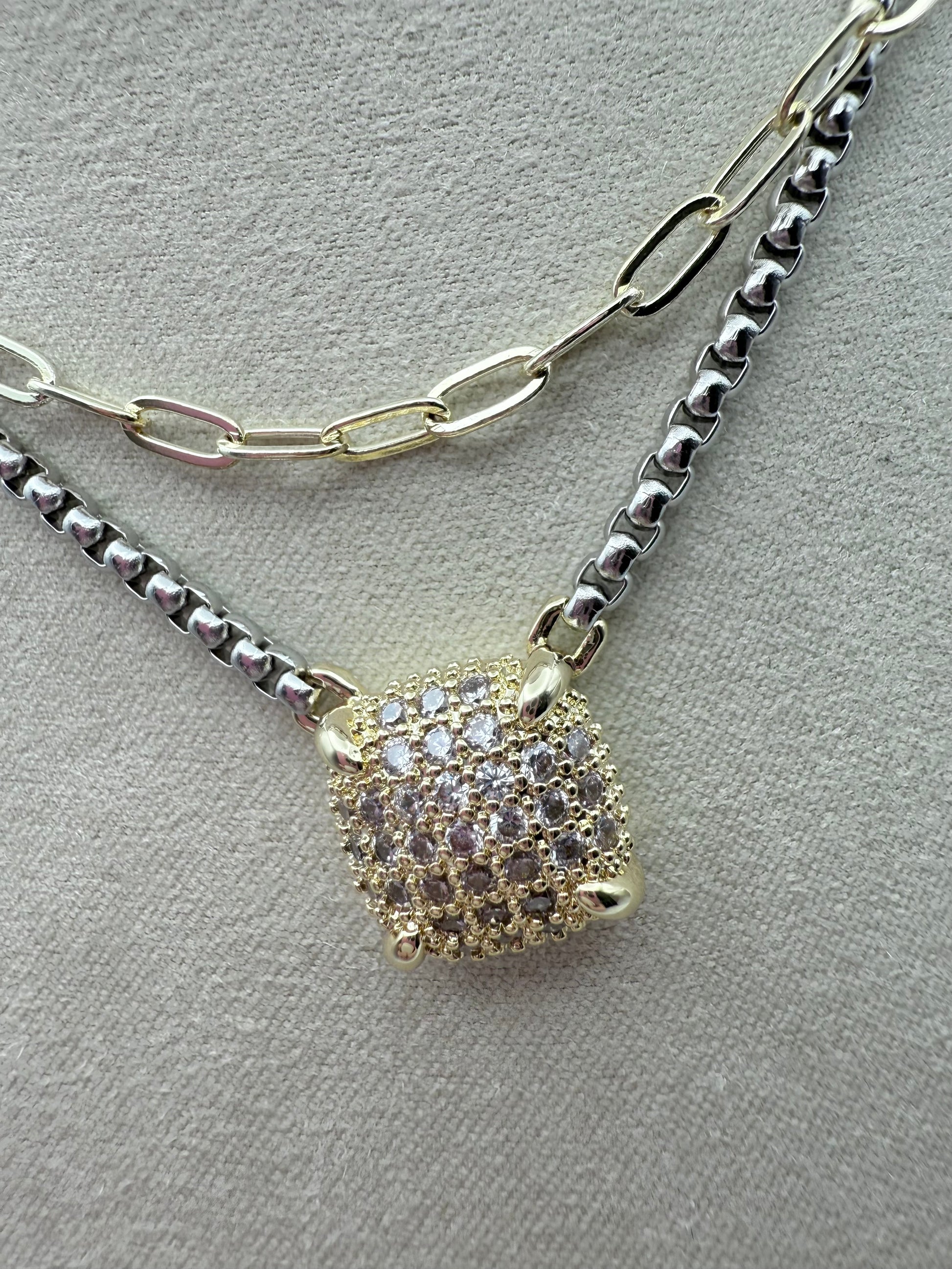 Gold and silver meet in perfect contrast, anchored by a cushion-cut square pendant crusted in pavè for maximum sparkle. A sleek, versatile piece that blends metals effortlessly, made to stand out whether worn solo or layered.